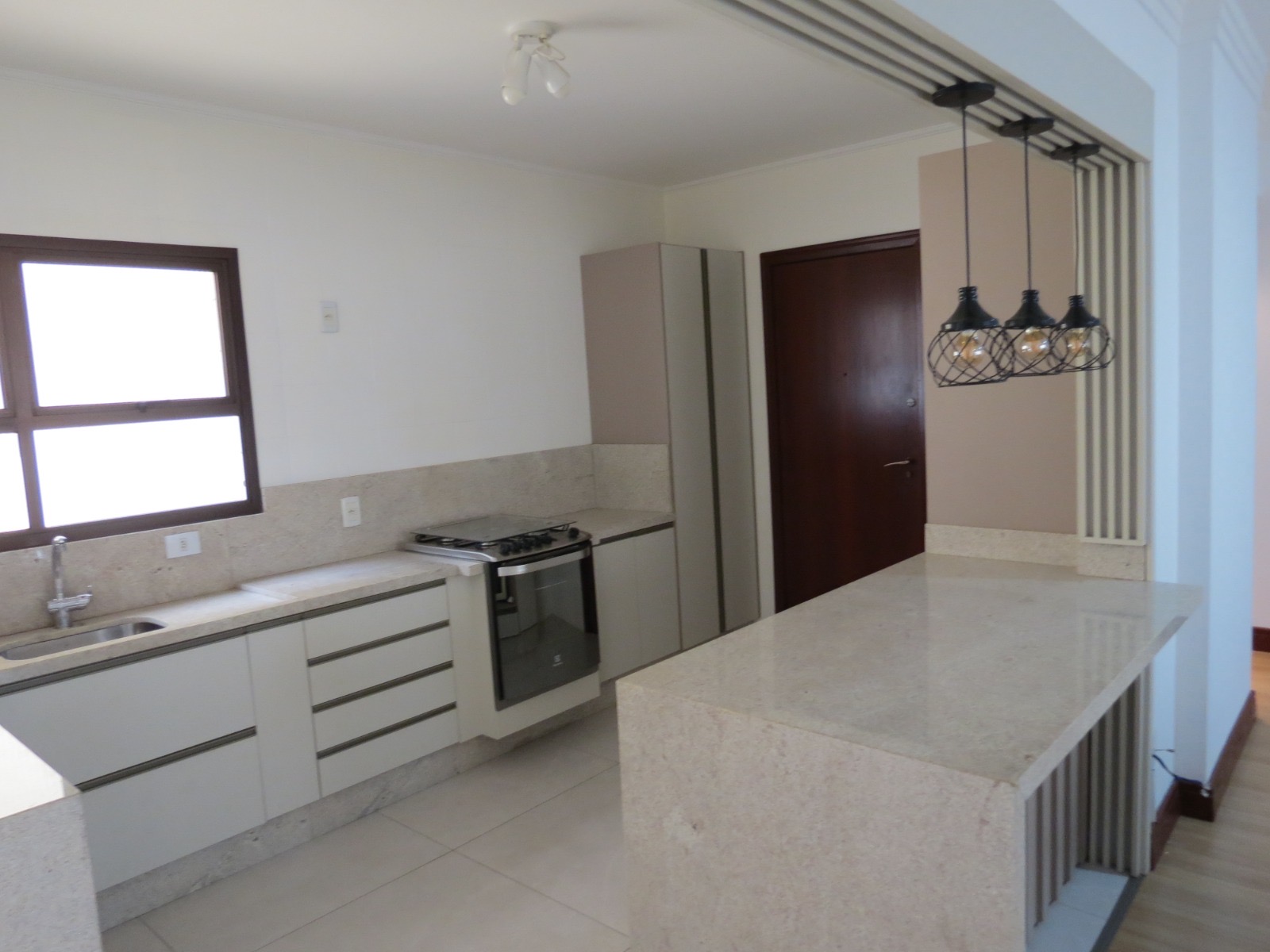 A cozinha em conceito aberto integra funcionalidade e elegância, com armários planejados. O imóvel permanece mobiliado e conta com marcenaria sob medida na cozinha, dormitórios, closet, banheiros e área de serviço.
